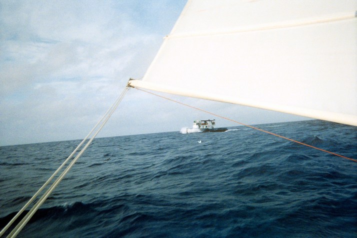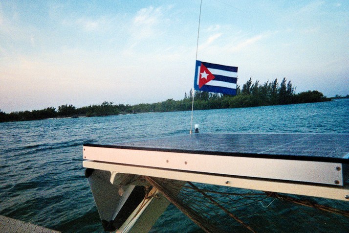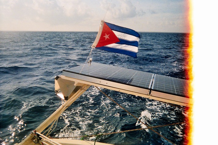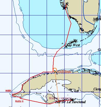 I cast off and motor to the sea buoy at the entrance to the marina then set the sails and strike the Cuban courtesy flag. Our course to Key West is due North but I peel off a couple of points West for the extra knot of speed on a reach. Two hours and fifteen minutes later we are in international waters and I head up and set course for the land of the free.