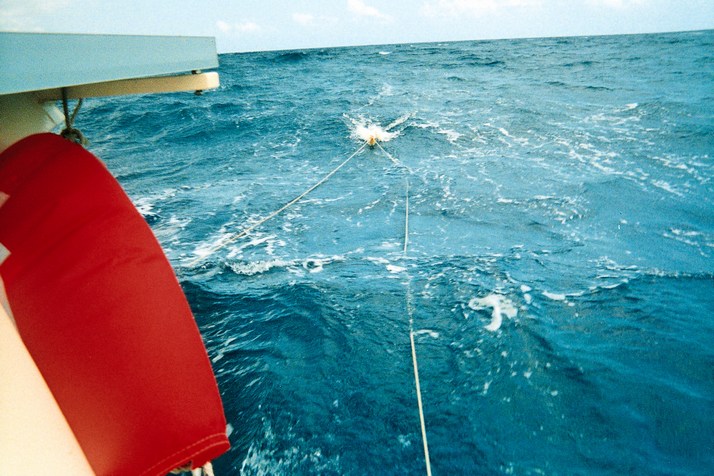 We head out at first light thru the thickening water and clear the end of the barrier reef. The wind is on our stern or quarters. Mid afternoon I approach close in to the bay at Isle of Pines. It is not a friendly coast. There are endless uncharted rocks extending a quarter mile from shore. The swell is our friend and points them out for us. The little bay which looks sweet on my charts has a barrier reef right across it. We won't be getting a good nights sleep in there. We press on. I work on helping Red the bungy cord with the downwind self steering. We are basically broad reaching to let the lateral plane help with that. I throw out some lines and buoys to see if they can help keep us on course.