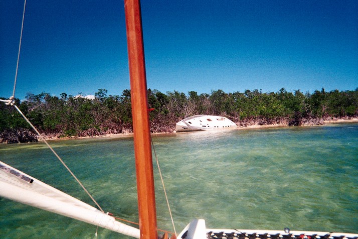 The thin water is very challenging. There are shoals where there is supposed to be 6 feet and sand where there is supposed to be 2. Three hurricanes in the past few years have made a joke of my charts. I am a little concerned sailing downwind at 4 to 5 kt not knowing what to expect ahead. We manage to drag the rudder tips at one point where there was supposed to be 6 feet. I am quickly deciding that perhaps the big blue would be a little less of a problem. That decision is helped by this tree sticking out of in 6 feet of water.